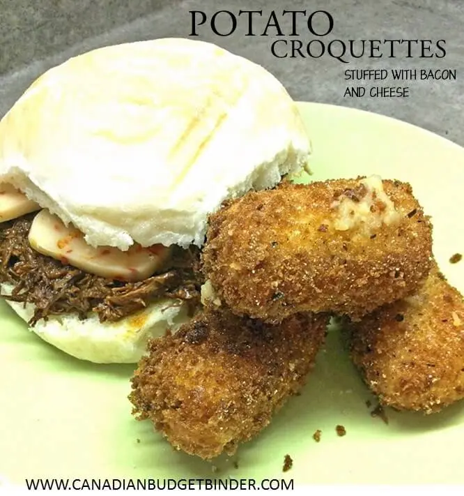 The potato croquettes are great to use up some mashed potatoes after a big lunch and are great to freeze. When freezing the potato croquettes simply them in cornmeal without the egg. They are crunchy on the outside but ooze cheese and bacon on the inside.